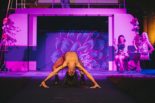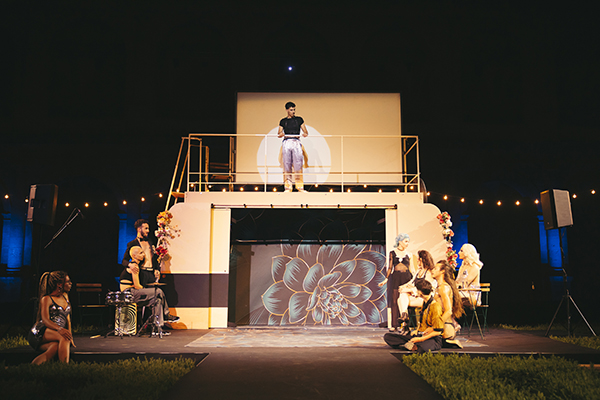 Una auténtica caravana preside un escenario donde también hay una pasarela, una pantalla de grandes dimensiones, unas escaleras que dan acceso a una segunda altura… Aquí nada es plano. Y cabe todo, desde batallas de Vogue, a poesía, canto y música en vivo, danza contemporánea o bailes urbanos. Diferentes lenguajes expresivos conviven con el teatro y la proyección de audiovisuales en una puesta en escena aderezada por un vestuario ecléctico, con texturas, colores y estilos tan diversos como la belleza de las flores que representa cada uno de los personajes-intérpretes.