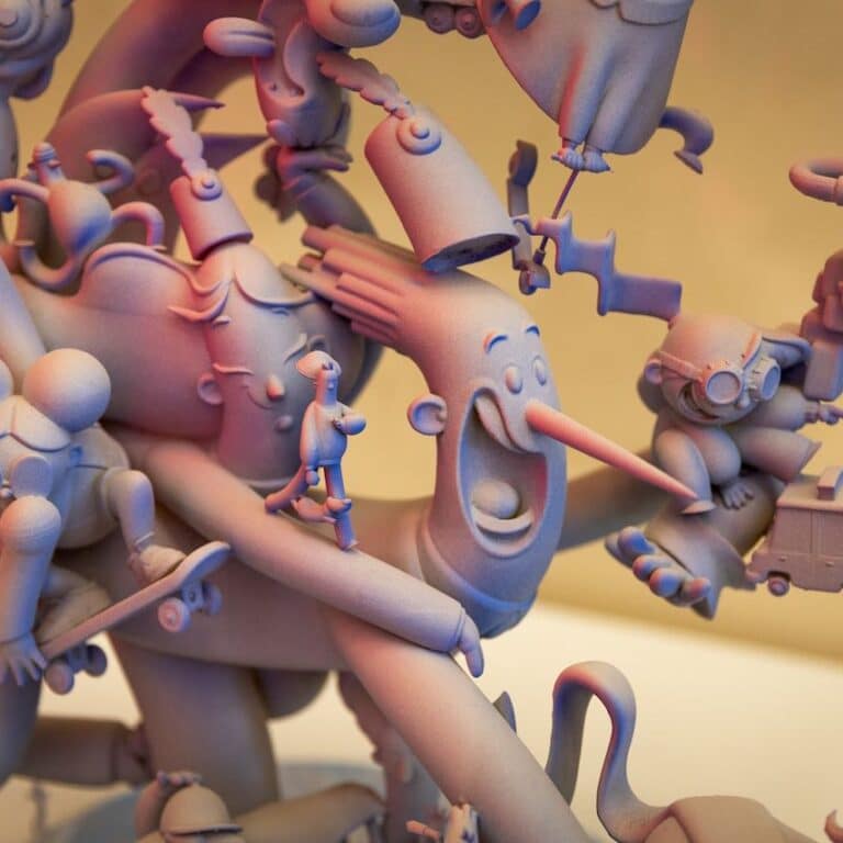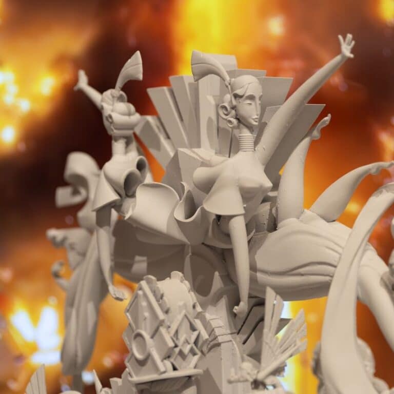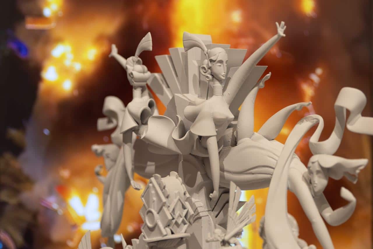 La muestra continua con una amplia selección de proyectos de diseño y escultura digital de fallas y hogueras, entre los que se encuentran los bocetos de la hoguera ganadora de 2025, ‘Vanity’, realizada por Paco Torres con el diseño de Camallonga.