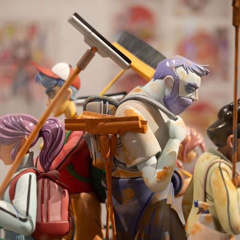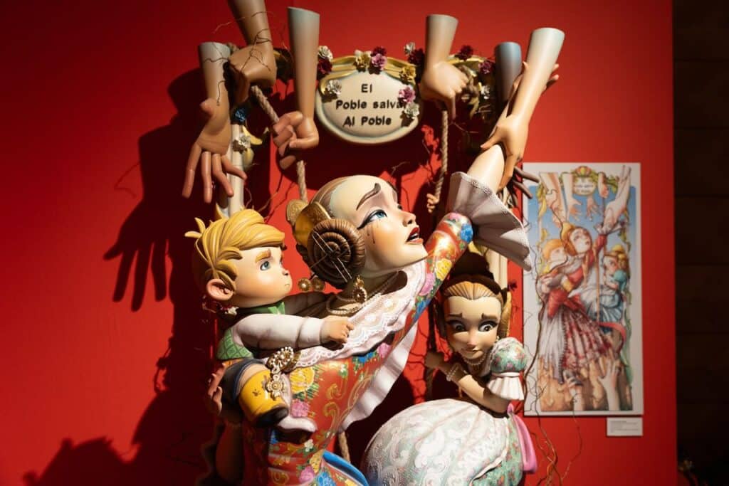 Así, la primera parte de la exposición está dedicada a estos ninots. Mención especial merece el icónico ‘El pueblo salva al pueblo’, indultado en 2025 por el Gremi d’Artistes Fallers, obra de Paco Torres para la falla del Pilar, y ‘Crisol de ilusiones’, también de Paco Torres, para la foguera Baver-Els Antigons, indultado por votación popular en las Hogueras de 2024. Destacan también ninots infantiles ‘Càpsula del temps’ (2019) para la falla Císcar-Burriana, ‘Que no caiga en l’oblit’ (2024) para la comisión Duque de Gaeta-Pobla de Farnals y ‘Puente de la Solidaridad’ (2025) para la falla del Pilar.