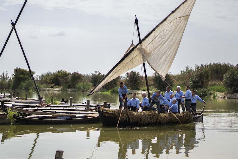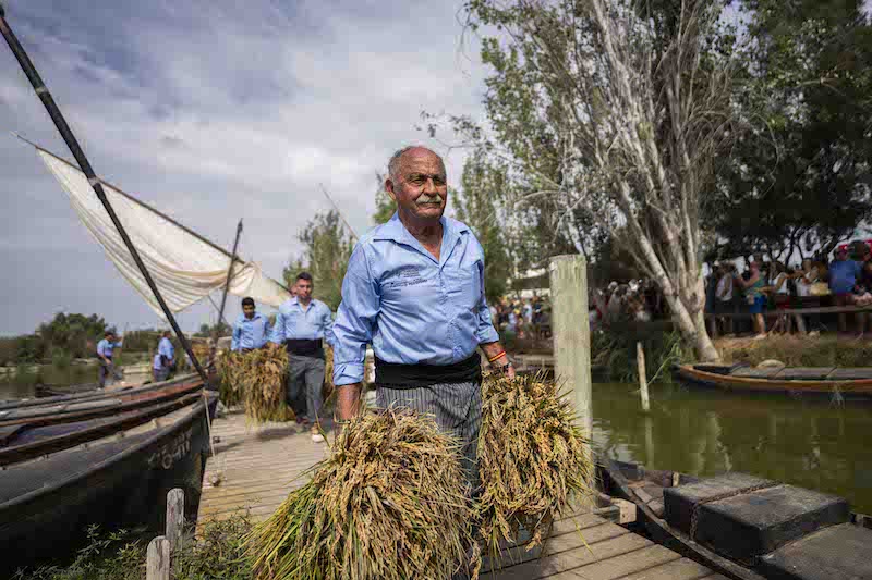 Una veintena de agricultores, vestidos a la antigua usanza, llegaron al pantalán sobre la típica albuferenca cargada de garbas de arroz. Allí trillaron un campo ante el público, acompañados por la Muixeranga del Carraixet, que puso música y color a la demostración.