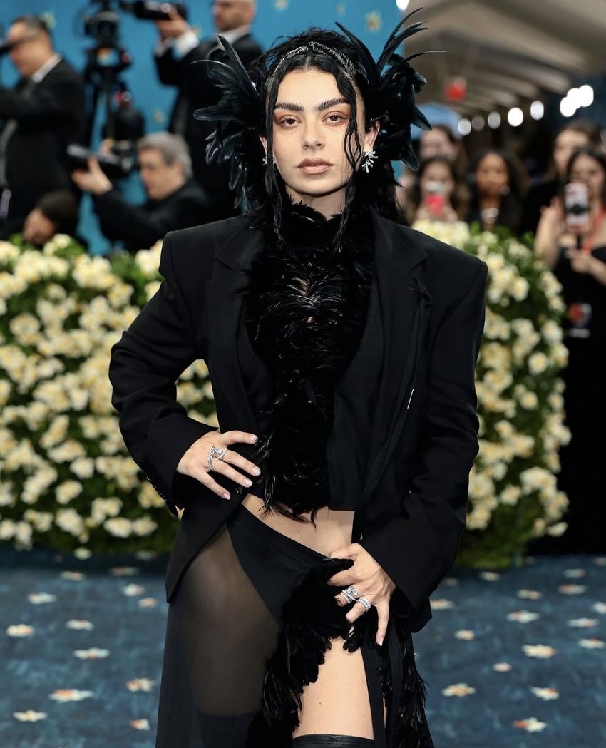 Charli XCX volvió a desatar furor con un conjunto oscuro y seductor de Ann Demeulemeester. Plumas, transparencias y cuero se fusionaron en un estilismo que parecía sacado de otro universo.