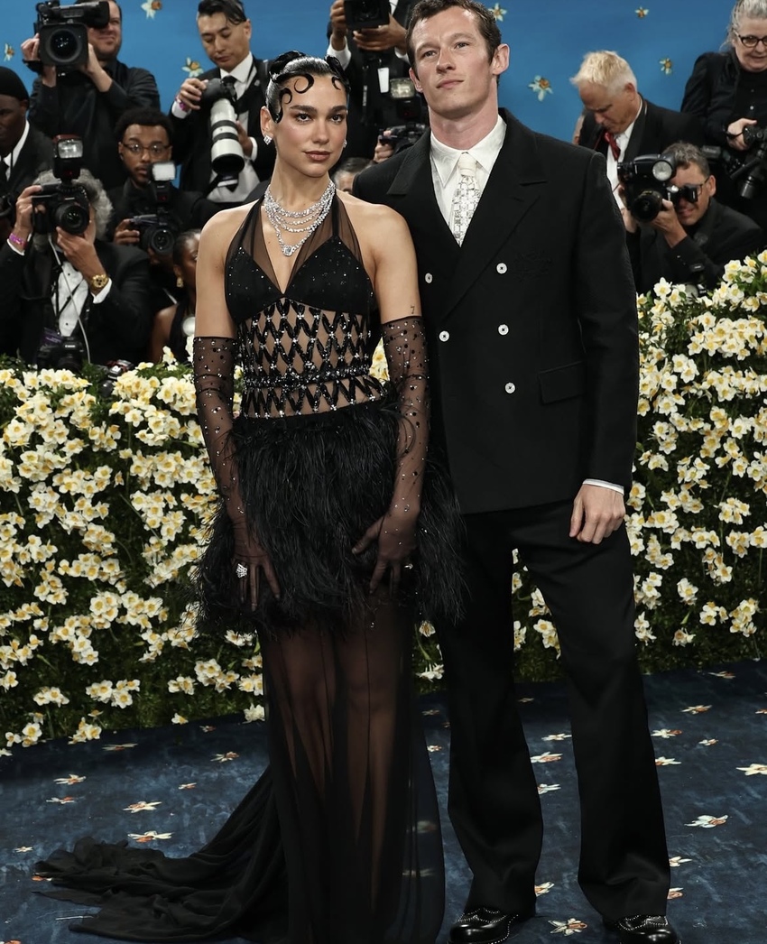 Por su parte, Dua Lipa, en un Chanel de Alta Costura, que llevó más de 2.000 horas de trabajo, también apostó por las plumas, bordados y transparencias, llevando el color negro a un dramatismo excepcional. A su lado, Callum Turner lucía un traje de doble botonadura, camisa de encaje blanca y mocasines con tachuelas.