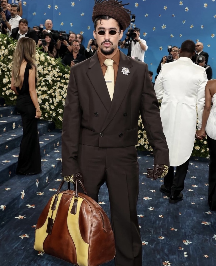 Khaby Lame sorprendió con un elegante traje gris de tres piezas, camisa blanca y corbata a juego, que destacaba por un chaleco adornado con relojes de bolsillo de diversos tamaños y estilos. Bad Bunny lució un traje sastre color café de Prada, complementado con botines blancos, gafas polarizadas, una bolsa retro y guantes. Su look, cuidado al detalle, fue elevado por un sombrero inspirado en la pava boricua, símbolo del jíbaro puertorriqueño.