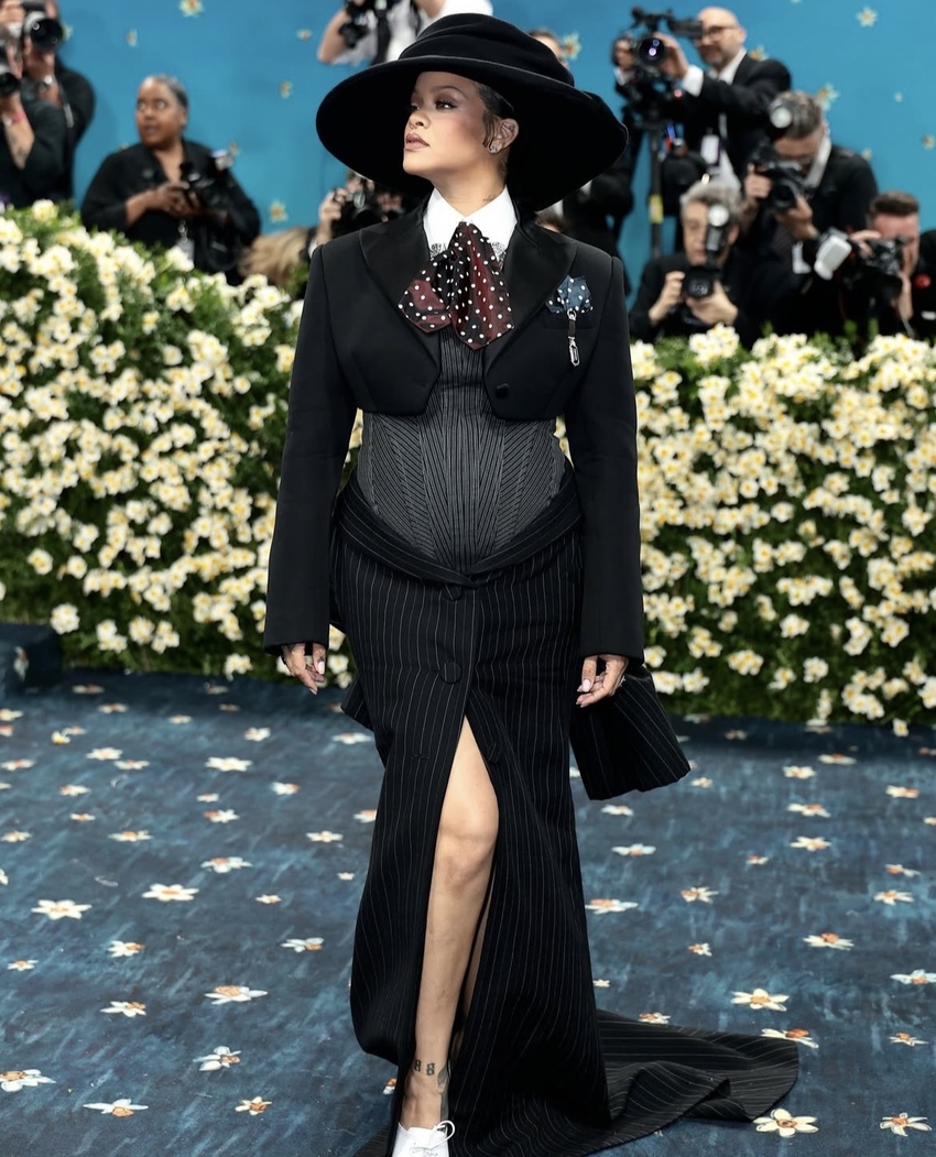 Rihanna nunca decepciona. Pero esta vez no solo brilló con un Marc Jacobs diseñado especialmente para ella, sino que aprovechó la ocasión para anunciar su tercer embarazo. El vestido jugaba con rayas diplomáticas, una chaqueta estructurada y una cola dramática con una especie de nudo a la altura de la cadera, todo rematado con un sombrero XXL y un lazo de lunares al cuello. Su marido, A$AP Rocky escogió un diseño propio para su marca AWGE, compuesto de una chaqueta de lana técnica de doble botonadura.