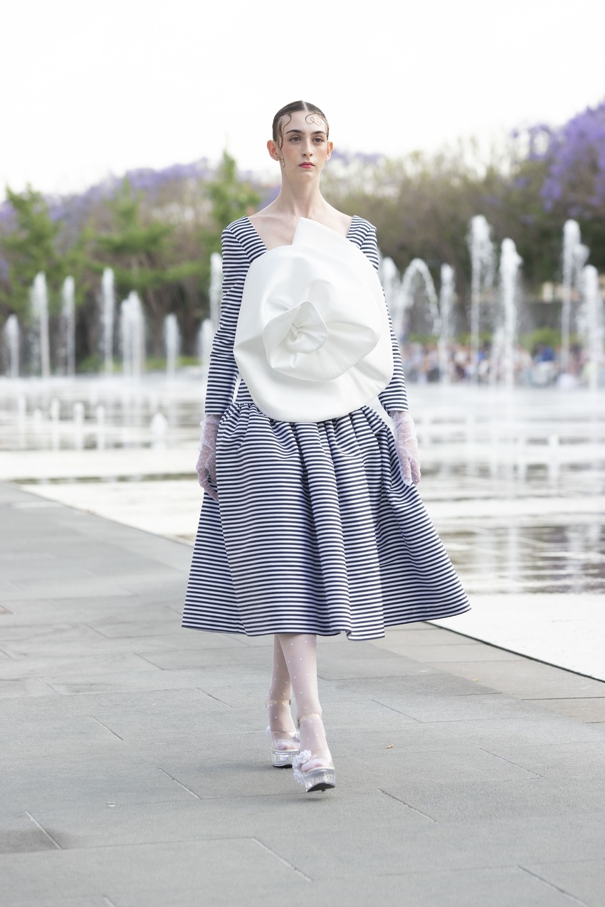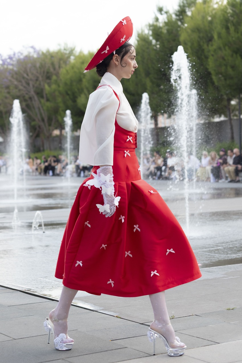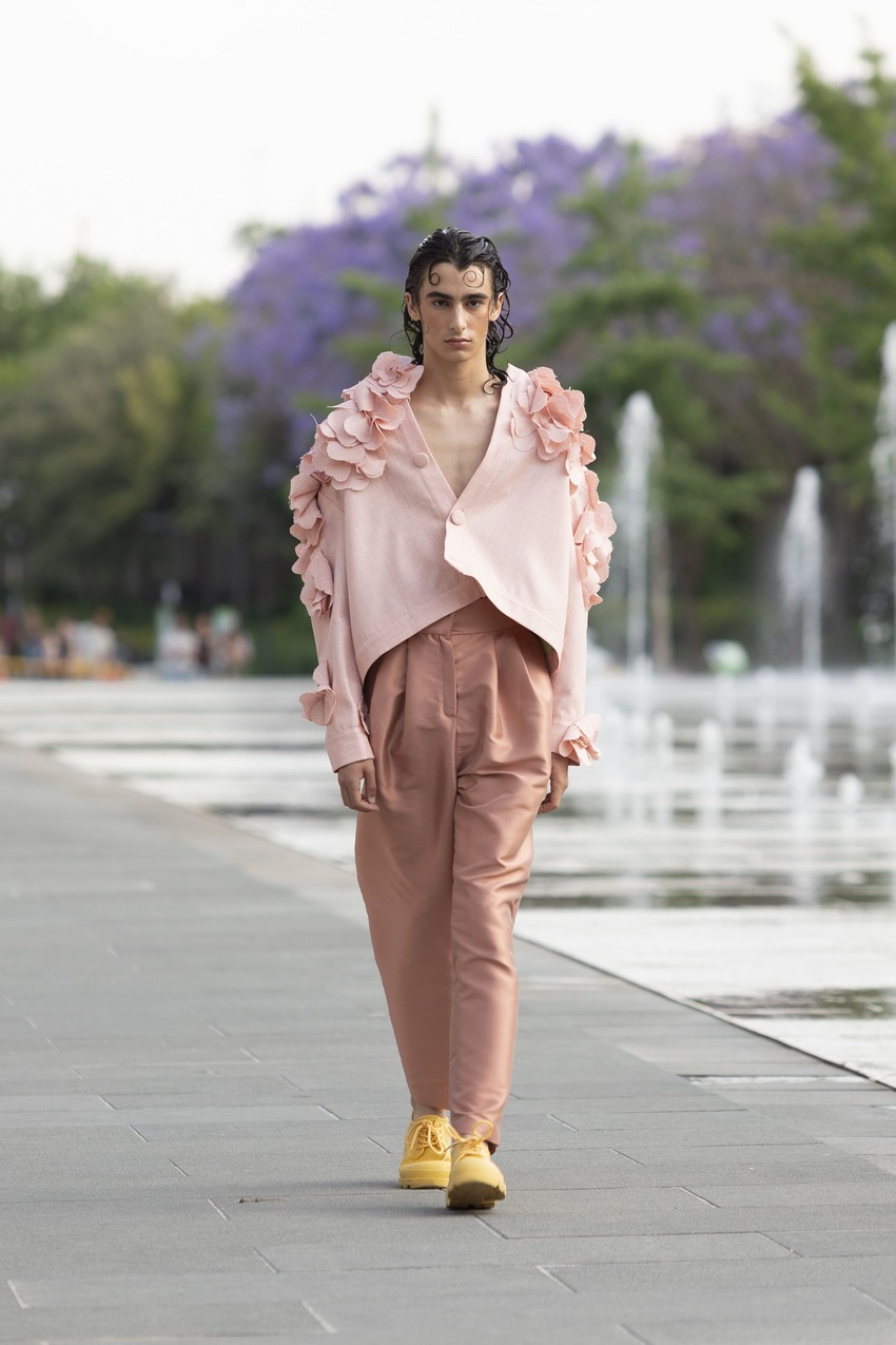 Inspirada en un paseo en barca, la muestra fue un despliegue de tejidos vaporosos que parecían flotar, lazos que dialogaban con flores en tonos pastel y siluetas alejadas del binarismo para abrazar lo etéreo. Benavente se mostró fiel a su estética: tonos empolvados, piezas artesanales, una confección meticulosa y una identidad clara que se va consolidando con los años.