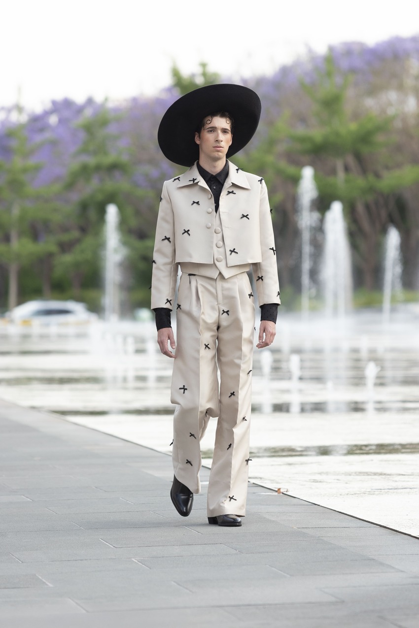 Tras el impacto estético que supuso su debut en San Miguel de los Reyes en 2024, Benavente regresó con una propuesta aún más audaz y refinada. Pues, Capriccio per Benavente introdujo, por vez primera, patrones y volúmenes tradicionalmente femeninos, pero concebidos desde un lenguaje sin género, ni etiquetas.