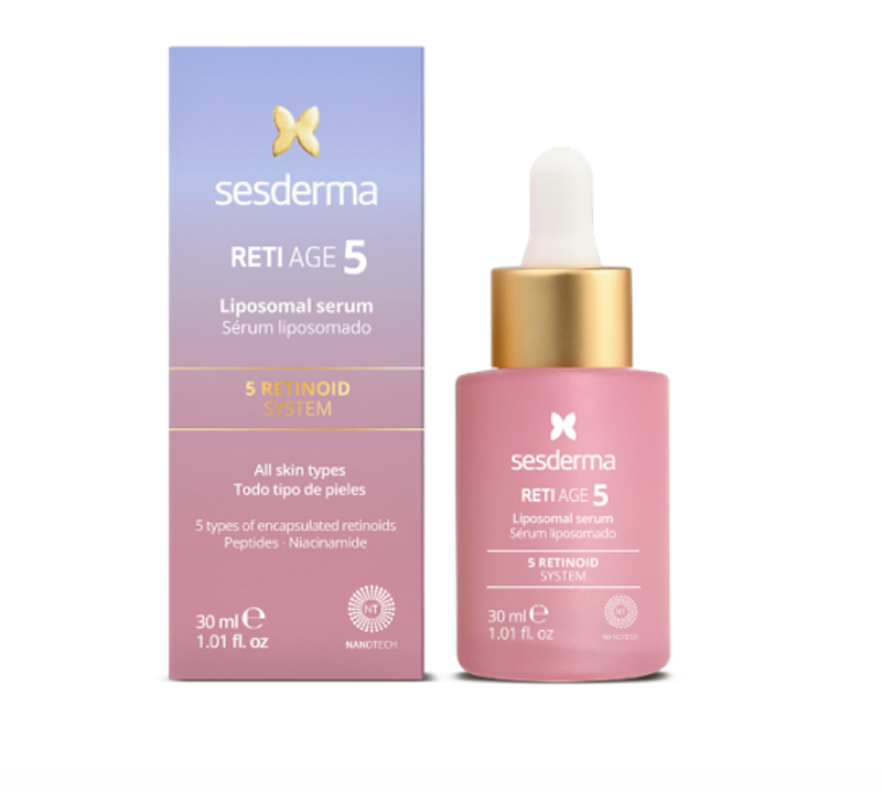 RETI AGE 5 contiene cinco retinoides de última generación encapsulados en liposomas. Su fórmula combina péptidos miméticos, ácido hialurónico y ceramidas, que mejoran la elasticidad y suavizan las arrugas.
