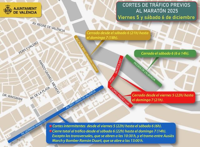 Los cortes de tráfico comenzarán el viernes a las 22:00 horas en la zona de salida del Maratón, en la Ciutat de les Arts i les Ciències, afectando calles como Institut Obrer, Germans Maristes y Puente de Montolivet.